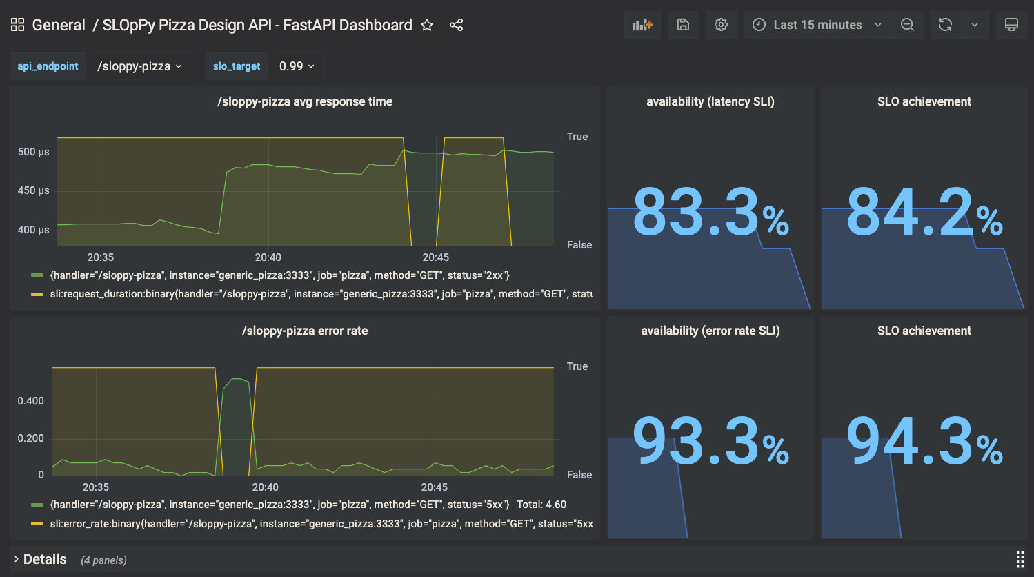 This small API developed in FastAPI framework is using Spacy NLP to analyse Wikipedia articles & create pizza ideas based on the extracted words. The code is instrumented for Prometheus metrics scraping and should serve as an example of how to use Service Level Objectives to understand how well the API is performing The stack comes with Prometheus and Grafana so you can directly observe the outputs.