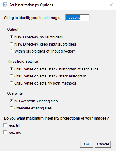 script to binarize the image in Fiji. Following options:- Output: New directory, no subfolders