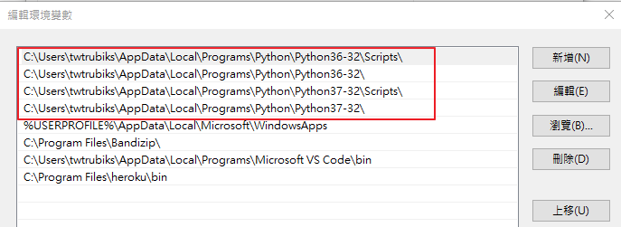 ,環境變數的部分如下,像是我自己有裝兩種不同版本的 python,