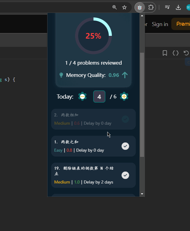 - 安装并启用插件:在 LeetCode/力扣题目页面右下角会出现