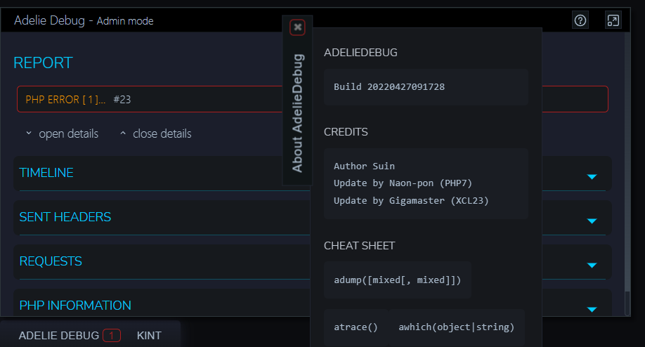 For more detailed introductions (Japanese) : [XOOPS Cube & TOKYO Pen's powerful debugging tool AdelieDebug | @suin ] (https://suin.io/530). [XOOPS で AdelieDebug利用中はリダイレクト停止させる | @RyujiAMANO ] (http://suin.asia/2012/01/06/xoops-adelie-debug).